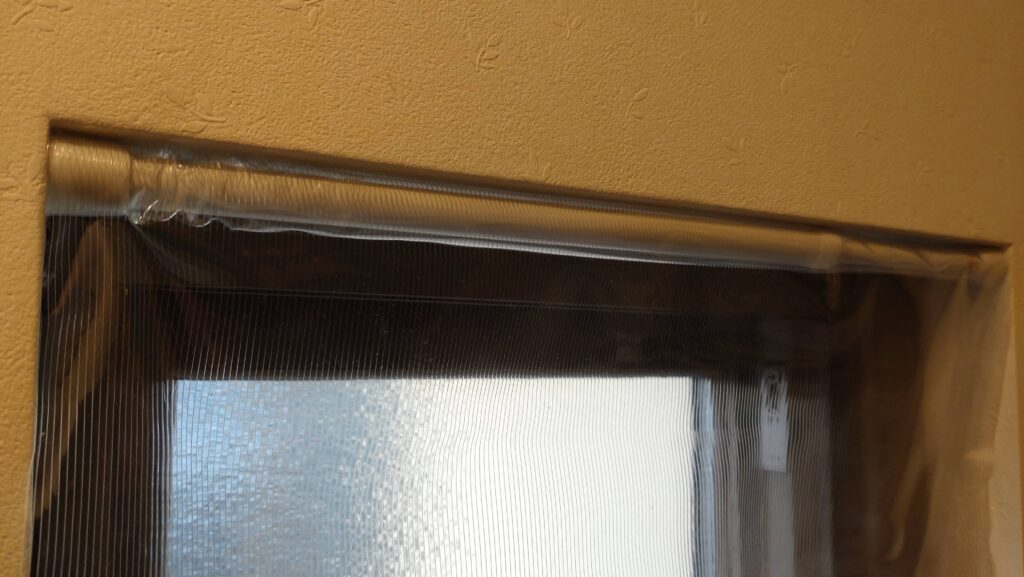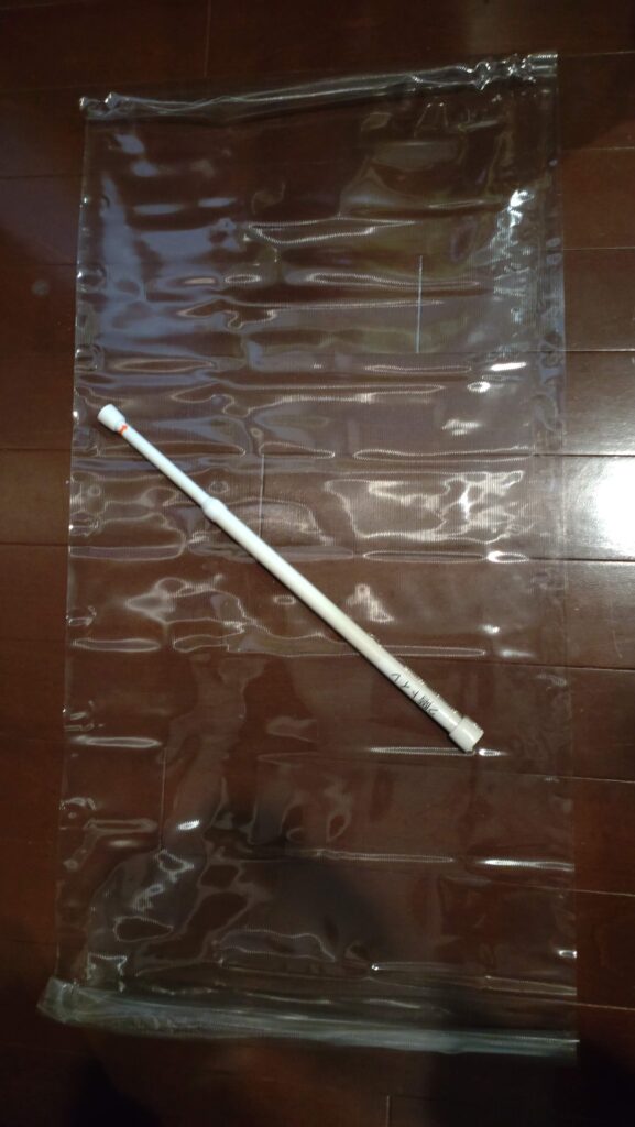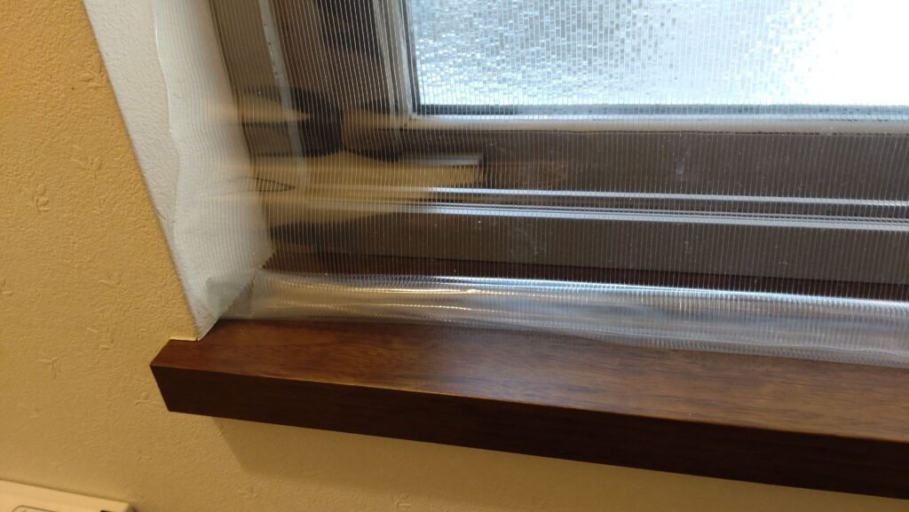 ビニールシートは窓の幅に合わせて切ります、縦方向の長さは長めに切って、上下ともに丸めます。